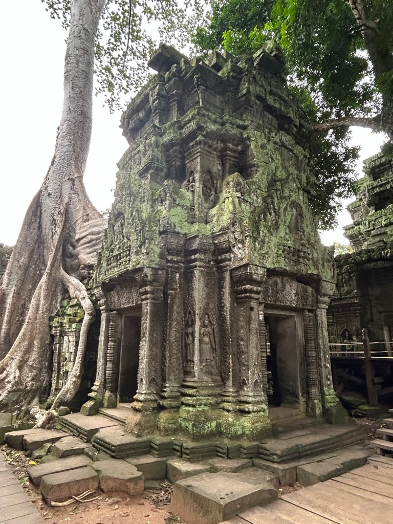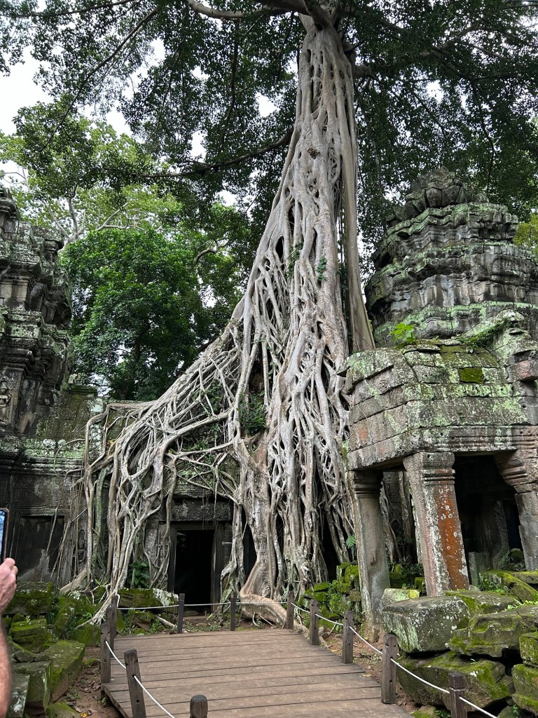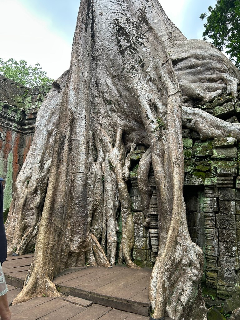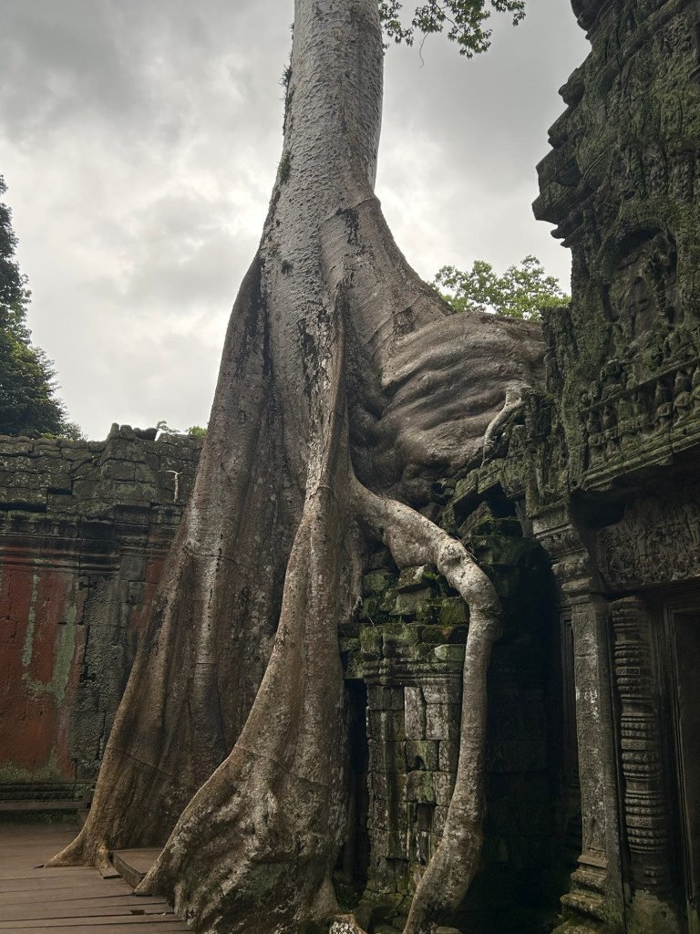 The temple sits in a semi ruined state, engulfed by dozens of massive fog trees that have formed into the brickwork of the temple.